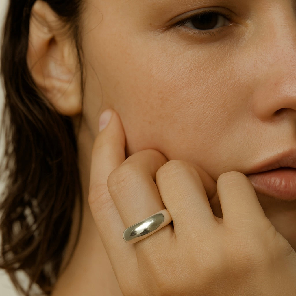 Design notes Extra-wide dome profile with sculptural presence Snug wide-band fit — we recommend sizing up ½–1 US size (≈ HK +1) Hand-forged process may leave subtle tool marks and weight variance, adding individuality to each ring